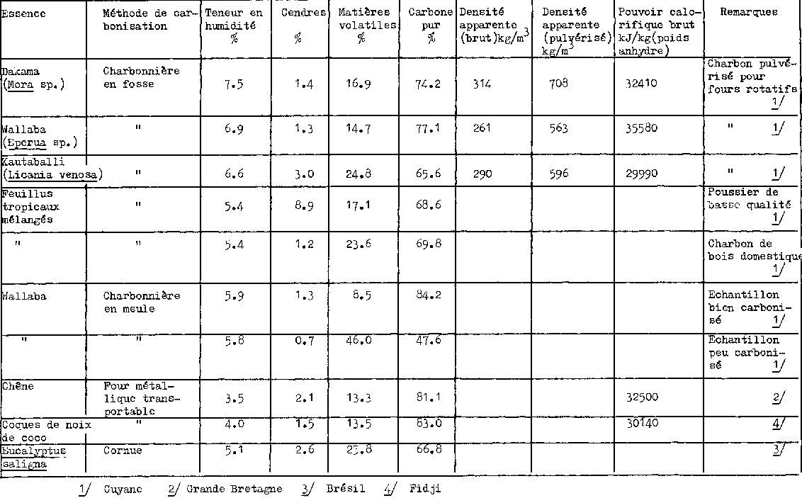 Pour illustrer le degré de variation de la composition que l'on trouve dans le charbon de bois commercial, le tableau 7 présente des résultats d'analyses d'échantillons aléatoires de charbon provenant de différentes sortes de bois, avec diverses méthodes de carbonisation. En règle générale, tous les bois et tous les systèmes de carbonisation peuvent donner du charbon de bois entrant dans les limites des normes commerciales.