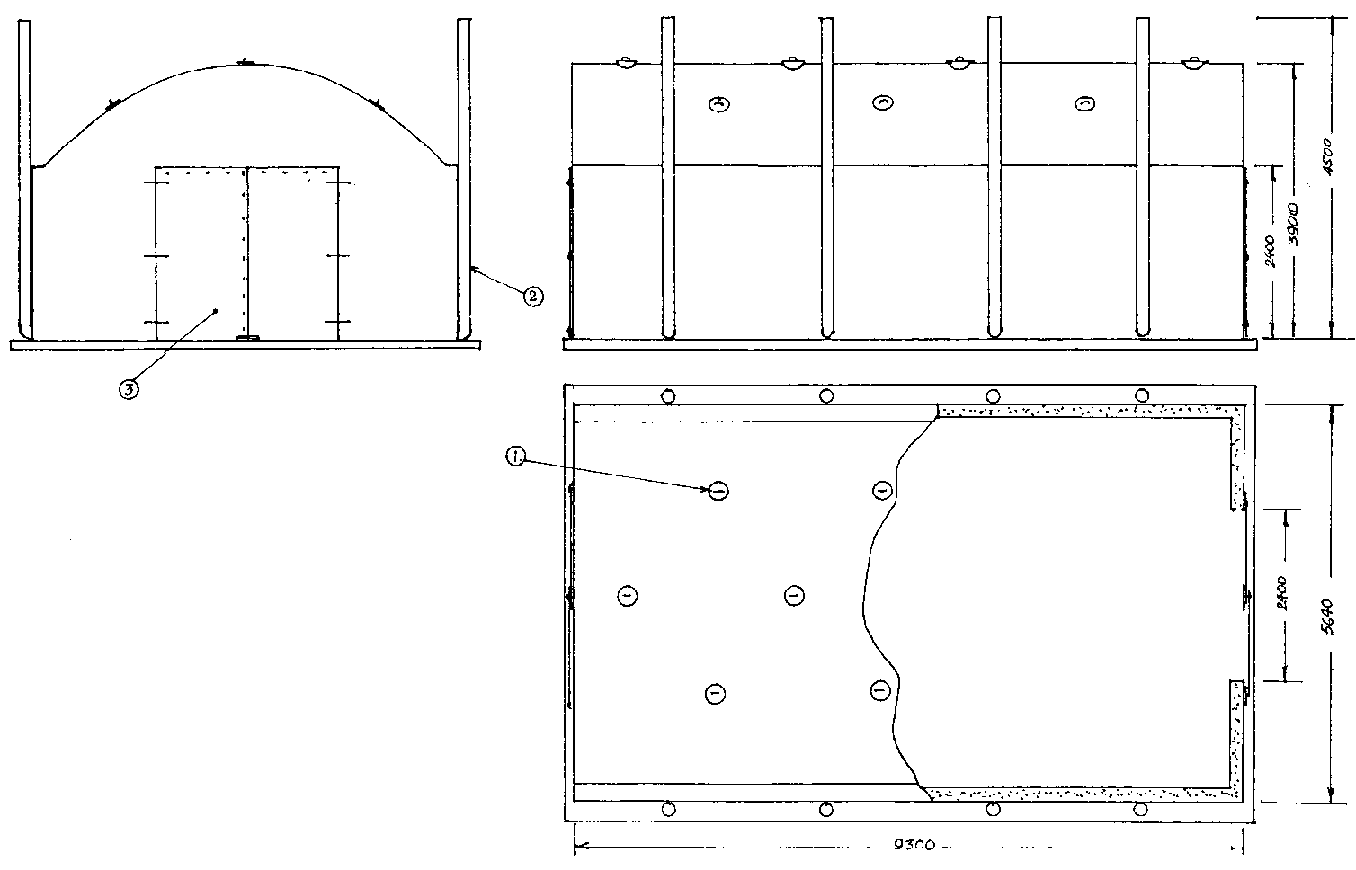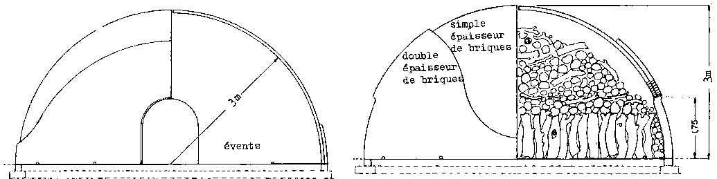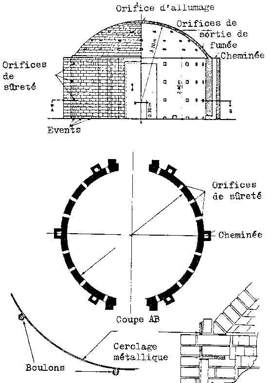 La figure 5 montre le dessin de ce four, qui est construit entièrement en briques. On utilise comme mortier un mélange de boue et de poussier de charbon, sans aucun fer de support en général. Le four a l'aspect d'un igloo hémisphérique, d'un diamètre d'environ 6 m (entre 5 et 7m). Les dimensions des briques sont de 24 x 12 x 6 cm. Pour la construction d'un four il faut compter 5500-6000 briques, compte tenu des briques cassées en cours de travail.