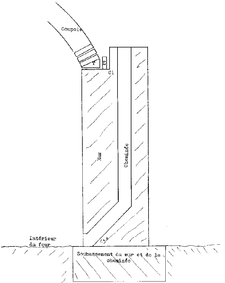22) Au quart de la distance entre la base de la coupole et son sommet, laisser 10 petites ouvertures équidistantes (B. Fig. 15), à la moitié de cette distance 10 autres ouvertures, et aux trois-quarts encore 6 autres. Ces ouvertures, appelées "bainas", ont une section de 7 x 7 cm. Au sommet de la coupole laisser un trou d'allumage de 20 x 20 cm (A, Fig. 15).