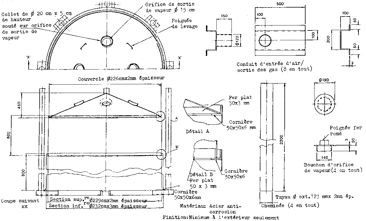 Si possible utiliser pour les parties en tôle, au lieu d'acier doux, de l'acier Corten "A", ou un acier anticorrosion analogue, qui donneront une durée de vie plus longue du four. Il s'agit d'aciers contenant jusqu'à 3% de cuivre, chrome, vanadium et phosphore, qui forment une couche durable d'oxyde ne nécessitant pas d'autre protection. Si l'on ne dispose pas d'un tel acier, ou si le four doit être entreposé pendant quelque temps avant utilisation, peindre l'extérieur avec une peinture au minium ou autre antirouille. Une fois le four en service, la peinture sera peu à peu brûlée, mais elle assurera une certaine protection contre la corrosion extérieure.