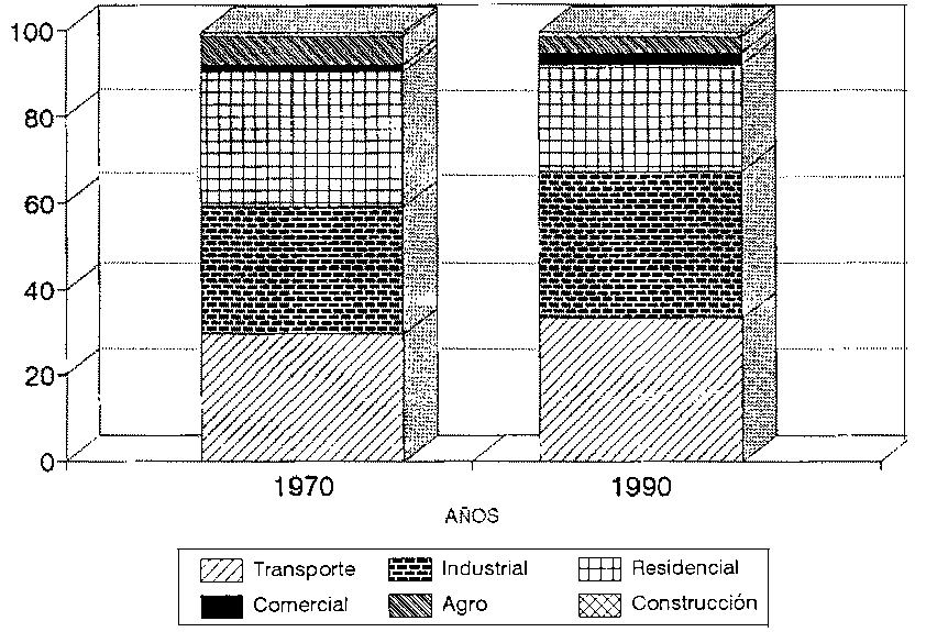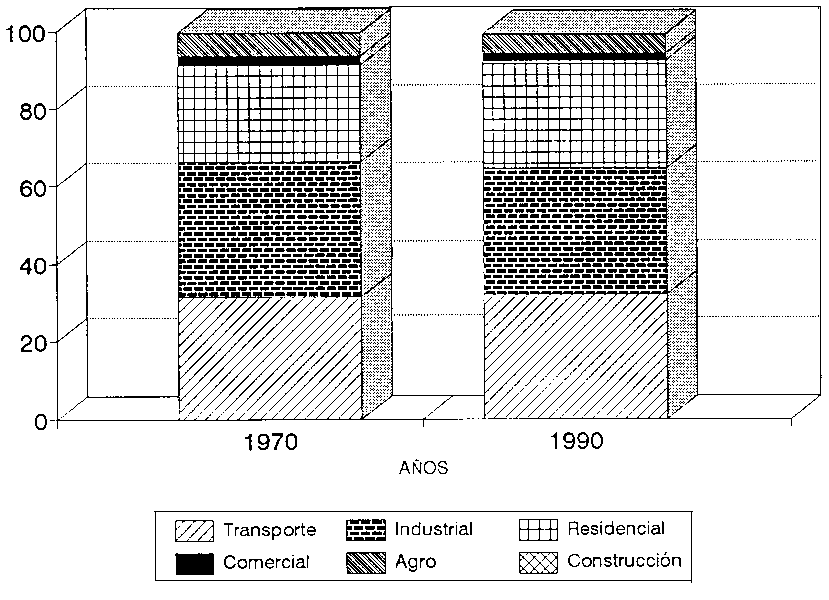 Globalmente, teniendo en cuenta los principales sectores consumidores, o sea Transporte, Industria y Residencial, la participación de este subconjunto en el CEF en 1990 totalizó 92,7 por ciento y en el año 1970 91,5 por ciento. La evolución en la participación de los sectores mencionados, en el CEF, fue la siguiente (en por ciento):