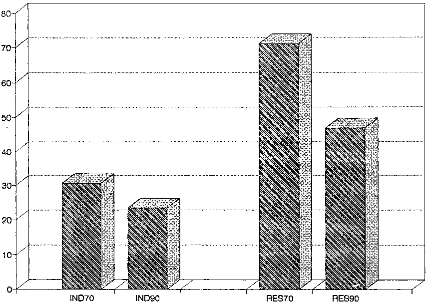 La menor disminución (en términos relativos) de los Bioenergéticos en el CEF del sector Industrial entre los años 1970 y 1990 se explica tanto por el mayor uso (en términos absolutos) de bioenergéticos, con un fuerte incremento de Residuos y Carbón Vegetal, como por los métodos de producción predominantes en los principales países consumidores de aquéllos, que posibilitan procesos de sustituciones entre fuentes bioenergéticas. En cambio, en el sector Residencial la fuerte disminución de la participación de estas fuentes en el CEF es el resultado del proceso de sustitución de éstas por fuentes de otro origen, principalmente Gas Natural y energía Eléctrica. En los Cuadros N° 16 y 17 insertos en el Anexo 1 está la información desagregada por país.