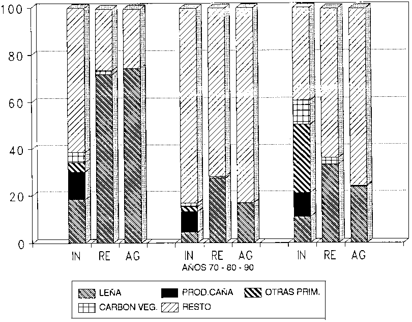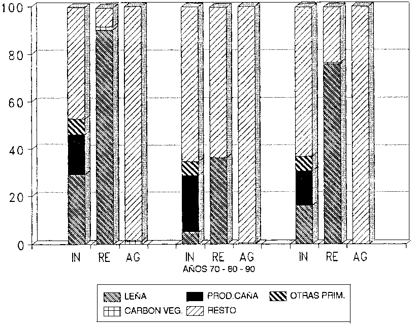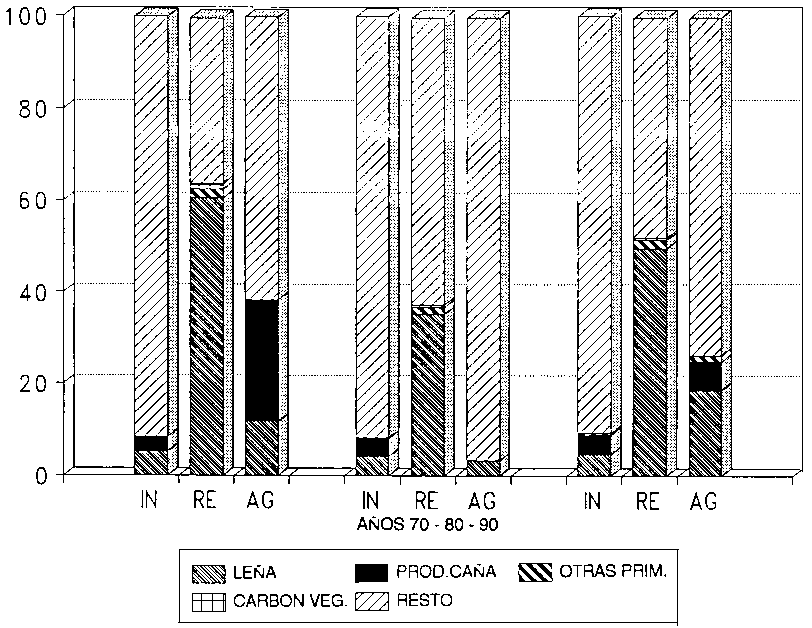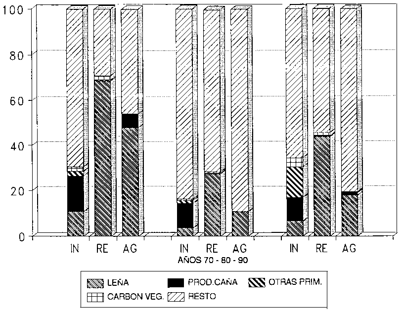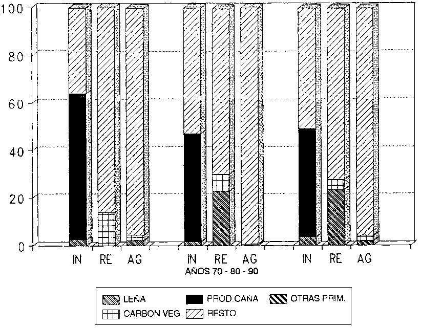 Debe señalarse que la disminución de la participación de Bioenergéticos en el sector Industrial de los PAISES DE HABLA HISPANA DEL CARIBE fue determinada, como ya se dijo, por la critica situación de la industria azucarera, que implicó una sustantiva baja en el consumo de bagazo como fuente de energía. En cambio, las energías de Biomasa poco más que duplicaron su participación en el CEF del sector Residencial.