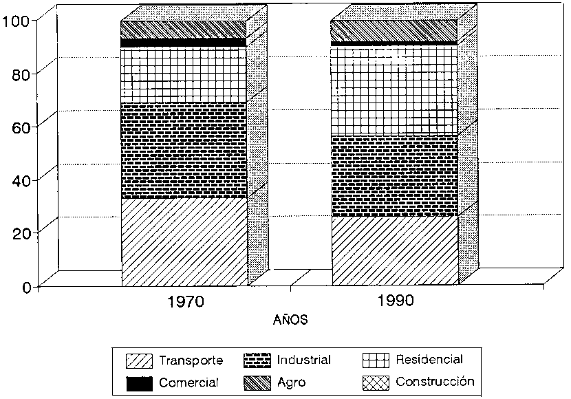 Globalmente, teniendo en cuenta los principales sectores consumidores, o sea Transporte, Industria y Residencial, la participación de este subconjunto en el CEF en 1990 totalizó 92,7 por ciento y en el año 1970 91,5 por ciento. La evolución en la participación de los sectores mencionados, en el CEF, fue la siguiente (en por ciento):