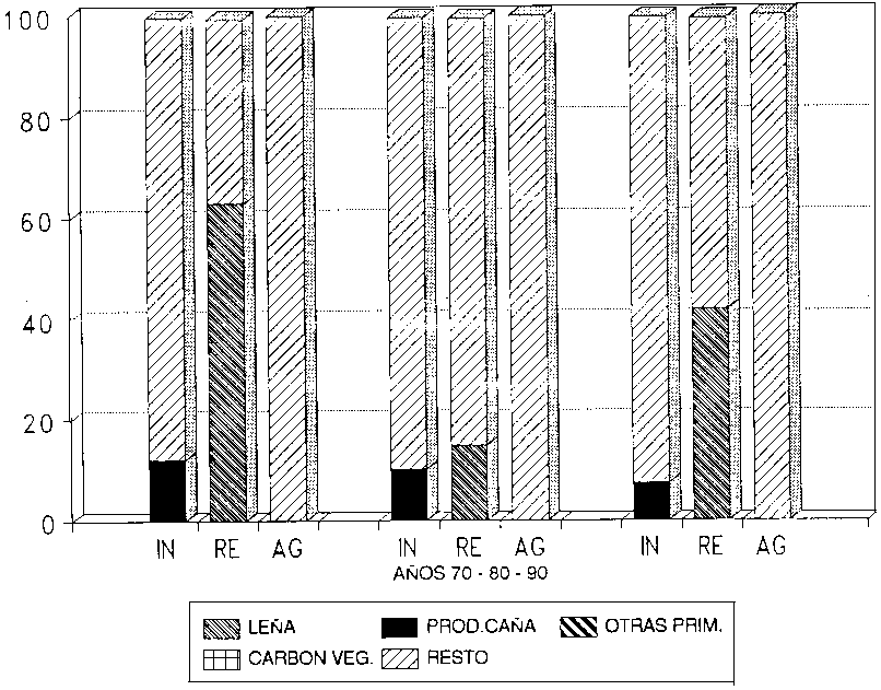 Debe señalarse que la disminución de la participación de Bioenergéticos en el sector Industrial de los PAISES DE HABLA HISPANA DEL CARIBE fue determinada, como ya se dijo, por la critica situación de la industria azucarera, que implicó una sustantiva baja en el consumo de bagazo como fuente de energía. En cambio, las energías de Biomasa poco más que duplicaron su participación en el CEF del sector Residencial.