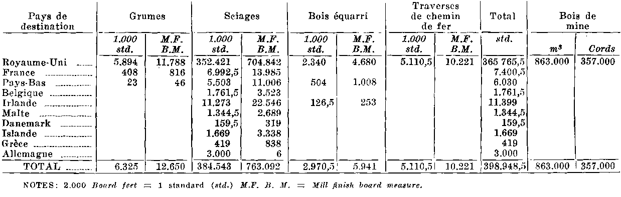 D'autre part, les possibilités, limitées en main-d'uvre qualifiée et en équipement, permettaient à la Suède de couper environ 50 millions de mètres cubes, pour la saison d'hiver 1945/46. Cette quantité maxima devait être répartie, d'une part entre les besoins de la consommation intérieure en bois de feu, tels qu'ils sont exprimés ci-dessus, et d'autre part, les exportations que la Suède comptait pouvoir effectuer en 1946. Les exportations prévues étaient les suivantes: