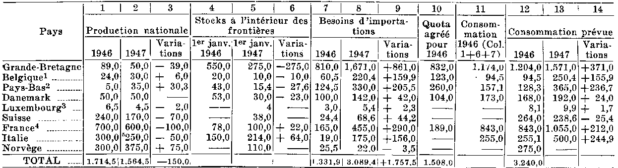 Nous verrons plus loin les efforts faits pour essayer de couvrir les besoins des pays européens avec les ressources de l'Europe. Si les exportations canadiennes ont permis de couvrir une partie importante du déficit européen, il n'en reste pas moins que l'accroissement des besoins domestiques en Amérique du Nord et en U.R.S.S., qui avant la guerre étaient les principales sources d'approvisionnement mondiales, est au moins égal à leurs possibilités de production; il faudrait donc ne pas fonder des espoirs excessifs sur une aide importante provenant de ces pays.