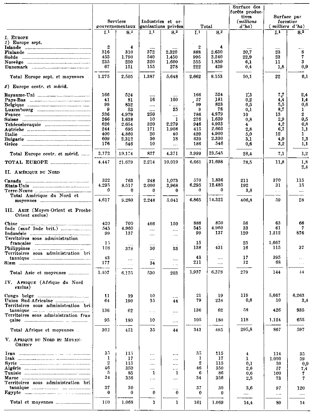 Enfin, si l'on revient au Tableau I (A) et qu'on considère l'Europe seule, on constate que les forêts privées y sont l'objet de soins sensiblement moins attentifs que les forêts publiques. Encore, la question posée paraît-elle avoir été parfois mal comprise, et il semble que certains pays européens aient inclus dans cette catégorie des techniciens du bois alors que par «forestiers employés dans l'industrie», le questionnaire entendait le personnel technique et subalterne employé par les industries et personnes privées propriétaires de massifs forestiers ou de droits de coupe en vue d'assurer la gestion de ceux-ci.