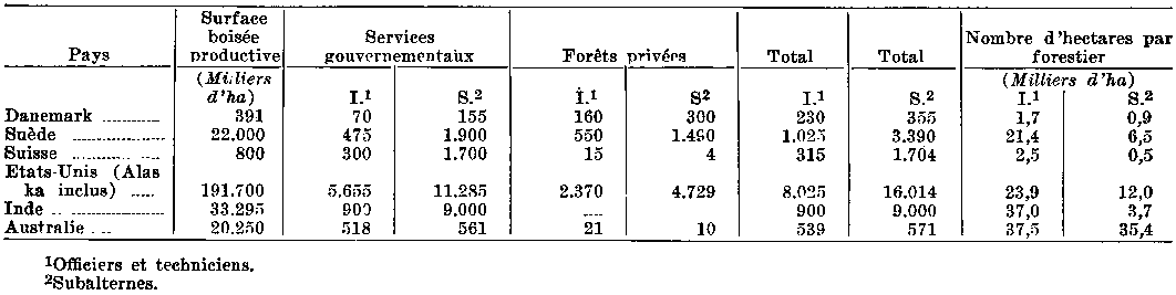 Néanmoins, si l'on se borne, comme on l'a fait au Tableau III (B), à certains pays où les hésitations qu'on pouvait avoir concernant l'étendue des forêts envisagées étaient plus réduites, et où déjà le développement des méthodes sylvicoles atteint un haut degré de perfectionnement technique, on est encore frappé des écarts enregistrés. Tandis que le Danemark estime nécessaire un technicien pour 1.700 hectares, la Suède estime suffisant un technicien pour 21.400 hectares, les Etats-Unis un technicien pour 23.900 hectares et l'Australie un technicien pour 37.500 hectares.