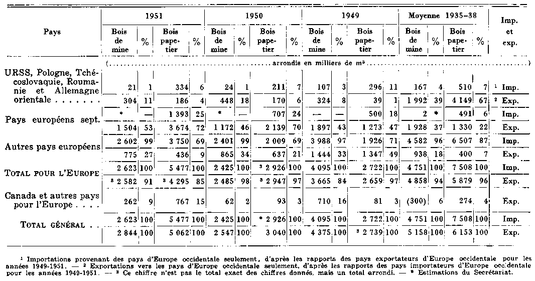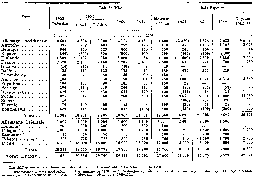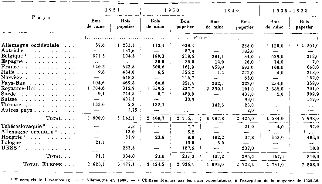 En 1951, la production totale de l'Europe (à l'exclusion de l'URSS) s'est élevée à 52.500.000 m³, 2.400.000 m³ de moins seulement que la production moyenne de 19351938. Les fluctuations de ces trois dernières années sont indiquées par le tableau I.