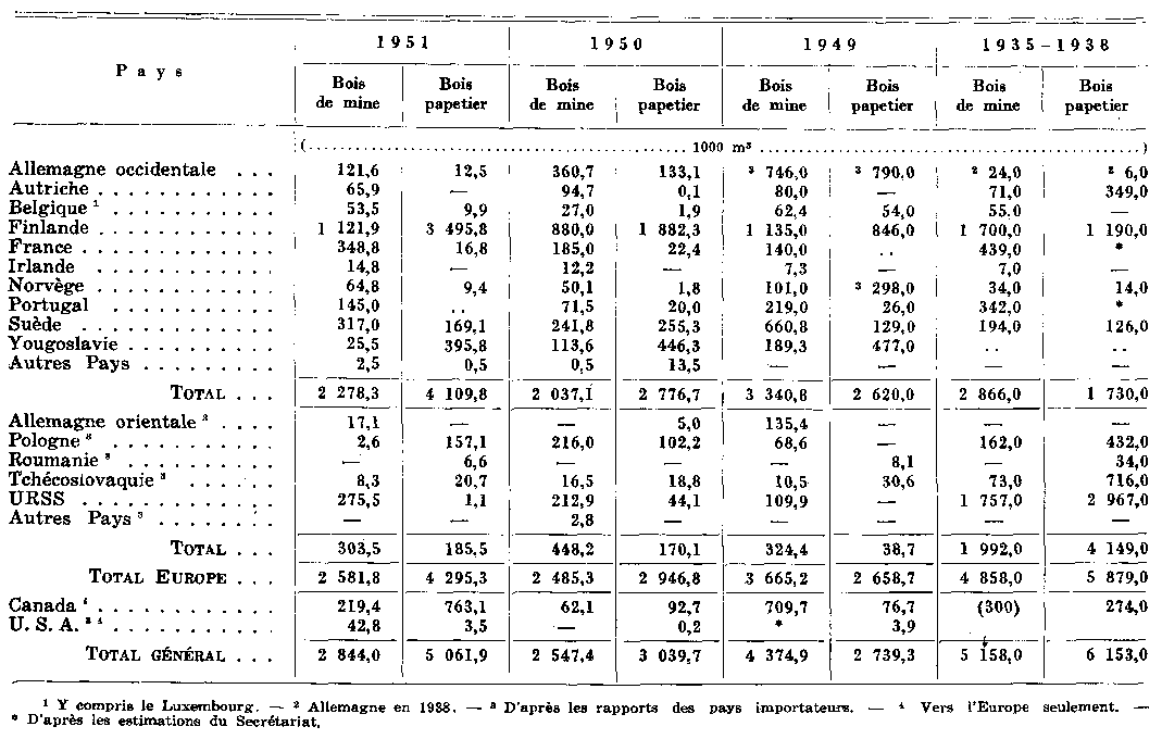 En 1951, les importations de bois papetier de la Suisse et des Pays-Bas furent très élevées, afin de profiter de l'état favorable du marché de la pâte et du papier, alors que les stocks intérieurs de bois de papeterie étaient presqu'épuisés. Les importations de bois papetier de l'Italie se sont constamment accrues depuis 1949, par suite des tendances favorables du marché de la pâte de bois, dont les exportations ont augmenté d'une manière continue.