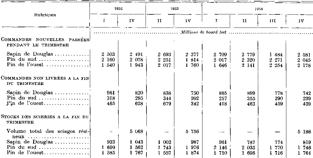 La production des Etats-Unis en 1953 s'est maintenue pendant toute l'année à un niveau élevé correspondant à celui des autres activités industrielles et économiques, et ne fut inférieur que de 1,5 pour cent environ au niveau record de 1950. Cependant, la réduction importante des achats du gouvernement au titre de la défense nationale et un certain amenuisement de la demande de produits durables par les producteurs et les consommateurs, ont provoqué une contraction de l'activité industrielle au cours du premier semestre de 1954, mais à la fin de l'année la production de la plupart des industries principales avait presque regagné les niveaux élevés précédemment atteints. Pour l'ensemble de l'année, l'activité industrielle a été inférieure d'environ 6 pour cent à celle de 1953. Ce fléchissement s'est traduit, dans la région, par une chute de production des sciages résineux qui est passée de 19400000 standards environ en 1953 à 18500000 standards en 1954, soit une régression de 5 pour cent. Le fléchissement de la demande des autres industries a été compensé par l'activité de la construction, qui est restée élevée aux Etats-Unis et au Canada, de telle sorte que la consommation apparente de sciages résineux n'a diminué que de quelque 3 pour cent. De ce fait, les consommateurs ont dû faire recours aux stocks, particulièrement durant l'été 1954 lorsque la grève des scieries réduisit l'approvisionnement des marchés en sapin de Douglas. Bien que les exportations canadiennes à destination des Etats-Unis aient augmenté, l'importance des stocks dans les usines des Etats-Unis fut, pendant la période correspondante de 1954, inférieure d'environ 15 pour cent à ce qu'elle était au cours du quatrième trimestre de 1953. Entre-temps, toutefois, le rythme de la production s'accéléra à nouveau à partir de la mi-1954.