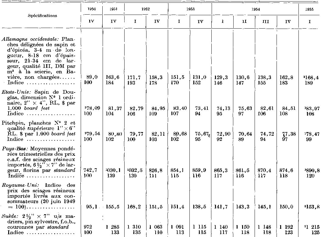 En 1954, la tendance générale fut marquée par une nouvelle progression des prix internationaux et intérieurs presque partout dans le monde. En Amérique du Nord, l'accroissement de la demande au cours du second semestre de 1954 détermina une nette montée des prix des sciages résineux, qui n'atteignirent cependant pas le niveau de 1952. En Europe, les achats importants des importateurs entraînèrent vers la fin de 1953 une hausse des prix d'exportation, et comme la demande resta élevée durant 1954, quelques nouvelles avances furent enregistrées vers la fin de l'année. Le niveau des prix de certaines catégories de basse qualité avait déjà été considéré comme excessif, et l'on espérait un certain ajustement des prix dans le courant du printemps de 1954. Toutefois, la grève des scieries de la côte du Pacifique, aux Etats-Unis, qui avait déjà provoqué un accroissement de la demande de sciages canadiens, entraîna pour l'Europe également une certaine hausse des prix canadiens. Etant donné qu'une partie des approvisionnements canadiens concurrence principalement les sciages de catégorie inférieure d'Europe septentrionale sur le marché européen, cette situation n'empêcha pas seulement les ajustements de prix attendus, mais conduisit même à une hausse.
