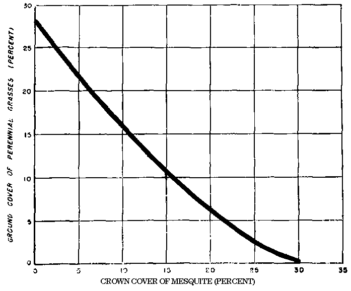 Cattlemen who have been battling the brush on their ranges feel that every noxious shrub is taking up space, nutrients, and water that ought to be used by more desirable forage plants. This suggests a quantitative, linear relationship between the number of shrubs per unit area of land and the amount of forage produced. Such a relationship is shown in Figure 4 (26). As brush increases in abundance the area occupied by grasses declines.