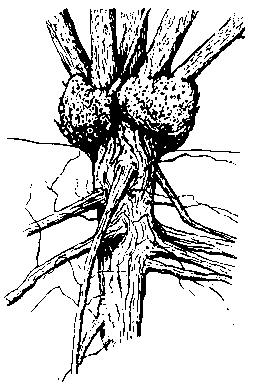 FIGURE 6. Location of dormant buds on stems of two woody plant,. Above, mesquite; right, sprouting juniper. In juniper the buds lie in a thick mass just above the soil surface whereas in mesquite they may be from 6 to 12 inches under ground. (Soil Conservation Service)