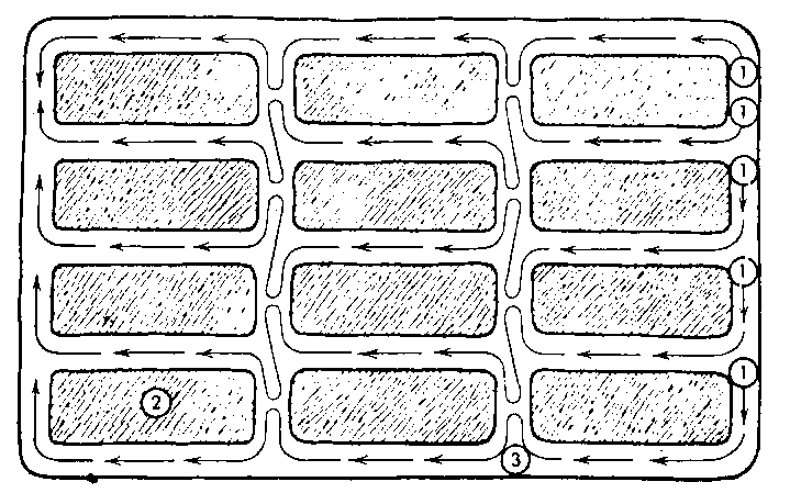 Trois méthodes fondamentales de mise à feu ont été utilisées. La plus simple et la plus courante est la mise à feu en lisière (fig. 44 gauche). On allume les feux le long des lignes de défense et ceux-ci sont dirigés vers le centre. Ce moyen est le plus sûr, en particulier pour les broussailles denses où il n'existe pas de piste de dégagement vers la ligne de défense. La superficie entière doit être située de telle manière que les courants d'air se dirigent vers son centre lorsque la mise à feu est faite le long du périmètre. Il est nécessaire de disposer d'une manière uniforme et continue de suffisamment de combustible sec pour conduire le feu vers toutes les plantes indésirables. La superficie doit être suffisamment petite ou suffisamment concentrée pour être incinérée dans la courte période de la journée où température, humidité et vent sont sensiblement constants.