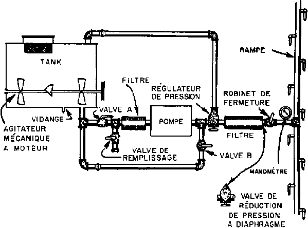 FIGURE Schéma d'un pulvérisateur à rampe. Ce modèle possède une pompe foulante et un agitateur mécanique. Les parties principales sont décrites dans le texte. [D'après Akesson et Harvey (1)]