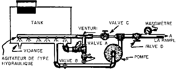 Des agitateurs sont nécessaires pour tous les mélanges de produits. L'agitation doit être continue avec les émulsions huileuses et les suspensions lourdes, il suffit d'une agitation intermittente pour les solutions aqueuses de 2,4-D, 2,4,5-T ou ammate. Un agitateur mécanique comprend une série de pales montées sur un axe qui traverse le fond du réservoir. Il peut être branché sur le moteur de la pompe. Une agitation hydraulique peut être assurée en faisant repasser une partie du liquide pris par la pompe à travers un tuyau percé de trous placé près du fond du réservoir. Ce dispositif fonctionne mieux avec une pompe centrifuge (fig. 54).