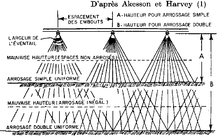 On emploie deux types d'embouts: ceux donnant un jet plat en éventail et ceux donnant un jet creux conique. L'embout plat couvre uniformément et avec plus de puissance. Une pression minimum de 10 à 25 pounds par square inch (0,7 à 1,8 kilogramme par centimètre carré) est nécessaire pour projeter l'éventail liquide. En augmentant la pression, on obtient un éventail plus large et des gouttelettes plus fines. Les embouts qui donnent un: jet conique ne se ferment pas aussi facilement, et sont moins bien adaptés pour produire un brouillard lorsqu'on pulvérise sous faible débit. La largeur de l'éventail, l'espacement des embouts et la hauteur de la rampe déterminent l'uniformité de la couverture (fig. 55). La consommation en gallons par acre peut être calculée par la formule suivante: