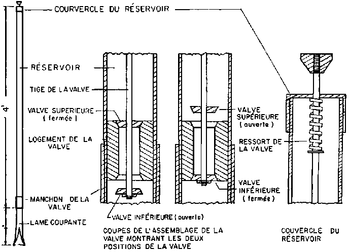 L'appareil «Cornell» (fig. 64). Cet appareil est constitué par deux tubes de sections différentes ayant au total 5 feet (1,5 mètre) de long. La partie supérieure a 4 feet (1,2 mètre) de long et sert de réservoir pour le produit; la partie inférieure est façonnée en forme de lame coupante à bord concave. Un cylindre de laiton percé d'un trou de 1/2 inch (1,27 centimètre) placé entre les deux sections, joue le rôle de clapet de fermeture et sert à doser le produit. Deux clapets sont attachés à une tringle de 1/8 inch (3,2 millimètres) qui passe à travers le cylindre et le réservoir; la longueur de la tige est telle que lorsque la valve supérieure est fermée, l'inférieure est ouverte, et vice-versa. Après avoir frappé avec l'outil coupant, on donne à la tringle un rapide mouvement de va-et-vient, ce qui permet à une quantité donnée de liquide de s'écouler dans l'entaille pratiquée dans l'arbre. Ce modèle d'outil a été mis au point à l'Université Cornell (9). D'autres «injecteurs pour arbres» sont basés sur le même principe, mais la valve balladeuse est actionnée automatiquement par le seul choc de l'outil sur l'arbre.