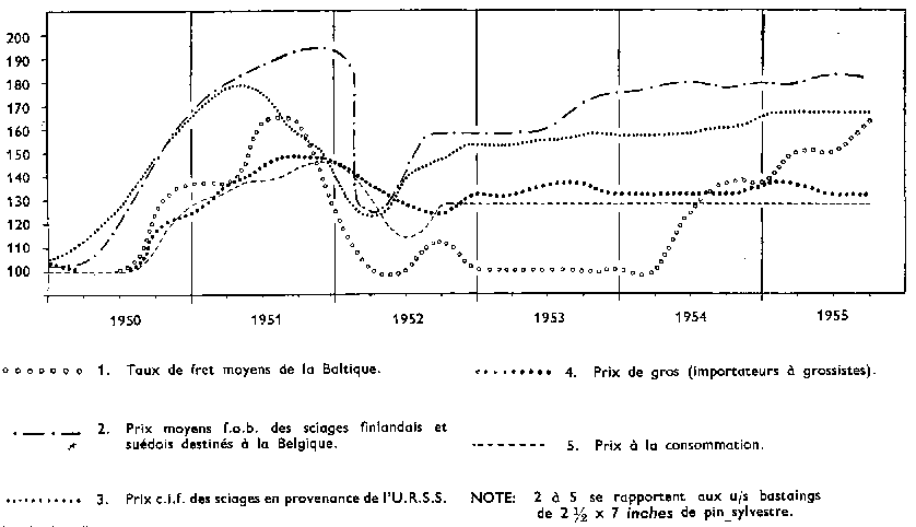 On a assisté, au cours des années passées, à une hausse constante des prix d'importation et à des efforts parallèles pour maintenir les prix à la consommation à des niveaux compétitifs; leur progression a été une source de sérieuse inquiétude pour la majorité des pays importateurs qui, tout en se débattant avec les difficultés financières, n'en étaient pas moins résolus à assurer des approvisionnements à peu près normaux à leur marché de consommation. Au cours de ces années, presque chaque stade du commerce du bois a vu ses marges bénéficiaires s'amenuiser de plus en plus, l'espoir que les effets néfastes du boom de 1951 s'effaceraient au cours des années suivantes, s'est jusqu'ici révélé vain. Le comportement des prix des sciages résineux aux différents niveaux du commerce belge, tel que le montre le graphique, serait également valable pour un certain nombre d'autres pays, d'Europe en particulier. Il met en évidence l'écart croissant entre les tarifs de base à l'exportation et les prix pratiqués sur le marché national.
