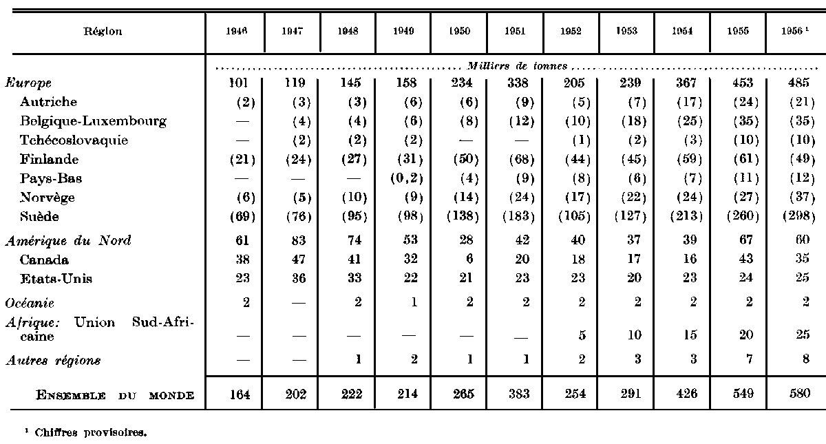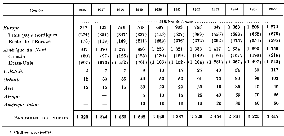 Au cours des sept années suivantes, la production des panneaux durs et des panneaux isolants s'est développée dans toutes les parties du monde. En 1955, la production des panneaux de fibres a dépassé pour la première fois les 3 millions de tonnes. Ceci ne constitue pas la limite de capacité de production - estimée à plus de 3 500 000 tonnes - mais il convient de tenir compte de la rapidité de création ou d'agrandissement des usines et du temps de rodage nécessaire. Une estimation provisoire de la production mondiale en 19,55 est indiquée dans le tableau 3.