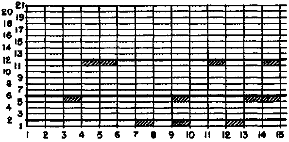 On a supposé (Figure 6) que les lignes 2, 6, 12 (marquées par un trait plus épais) sont sorties au sort et l'on a examiné individuellement chaque ligne de la première famille. Pour chacune de ces lignes on a tiré au sort, parmi les lignes de la deuxième famille qui coupent celles de la première à angle droit, à nouveau 14 lignes sur 100 (100 lignes de la deuxième famille équivalant à 60 m X 100 = 6 km sur le terrain).