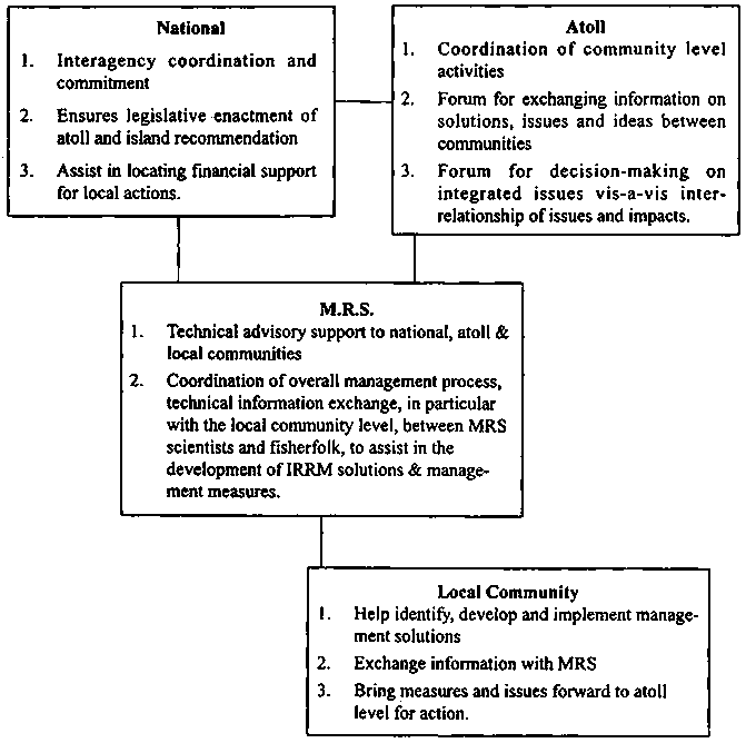 The boxes below describe the IRRM implementation frameworks, and the coordination between the Atoll, National and local community levels, and the MRS.
