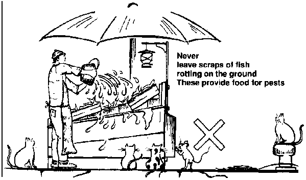 Although fish gutting and cleaning should be forbidden inside the harbour area, sometimes this practice cannot be helped. In order to avoid the spread of diseases which accompanies the presence of household pests, hawkers should be instructed on the proper disposal of unwanted wastes. Wet waste bins should be provided in ample quantities and placed in strategic locations.