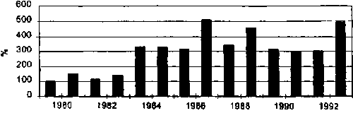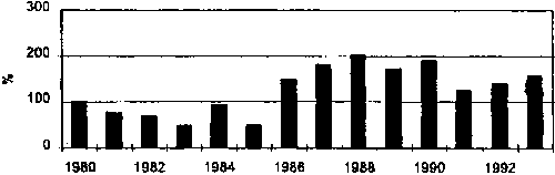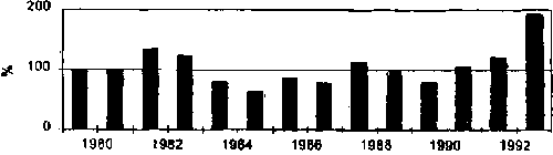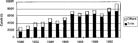 It is necessary to analyze further the fishery statistics of these islands. Coral reefs are considered the most productive among marine ecosystems, annually yielding about 9% of the world fisheries (Smith, 1978). As per the latest figures, the annual fisheries yield of Lakshadweep is around 9000 t, of which tunas constitute 7000 t. Though the total fish catch has only tripled since 1980, its value has increased sixteen fold (Fig. 7). In the absence of refrigeration facilities, most of the tuna catch is parboiled, smoked and dried to produce mas. The relationship between fishing catch and effort as well as between catch per unit effort and effort (Fig. 7) suggest that there is no overfishing. Data of fish catch and fishing efforts by boats operating from the mainland have not been taken into consideration. Data on fishing effort have not been standardized but are realistic, as fishing boats in Lakshadweep are more or less of the same size. The potential fish yield is estimated to be 90,000 t (Jones & Banerji, 1973) while the potential tuna yield is 50,000 t (George e/at., 1977). The pole and line fishing method for catching tuna requires live bait collected from coral colonies, resulting in reef damage. The total live bait catch is around 125 t (Pillal el al., 1995). Thus, an increase in fishing activities will increase requirements of live bait, which will in turn adversely affect the reefs. Modern methods, such as purse seining, gill netting and longlining, need to be adopted to increase the tuna yield. There is also scope for increasing the catch of sharks, bill and sail fishes and diversifying fish products. Floating ship factories with bases at mainland ports need to be introduced by a Lakshadweep Fisheries Co-operative to divert the impact of fishing boats away from Lakshadweep islands (Rodrigues, 1996).