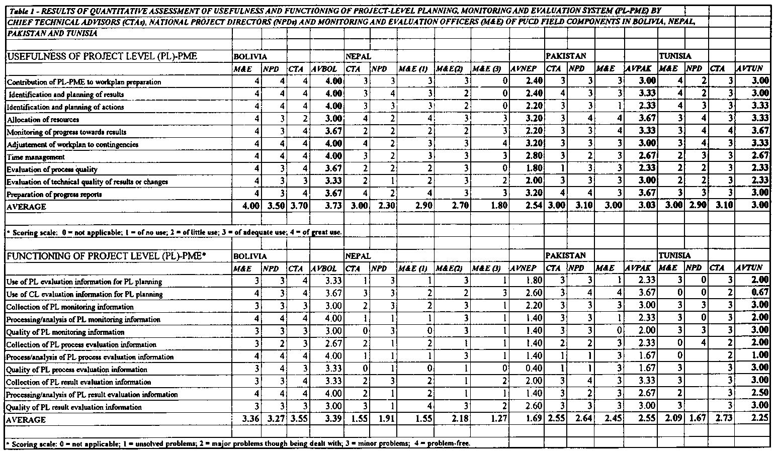 Table 1 - RESULTS OF QUANTITATIVE ASSESSMENT OF USEFULNESS AND FUNCTIONING OF PROJECT-LEVEL PLANNING, MONITORING AND EVALUATION SYSTEM (PL-PME) BY CHIEF TECHNICAL ADVISORS (CTAs), NATIONAL PROJECT DIRECTORS (NPDs) AND MONITORING AND EVALUATION OFFICERS (M&E) OF PUCD FIELD COMPONENTS IN BOLIVIA, NEPAL, PAKISTAN AND TUNISIA