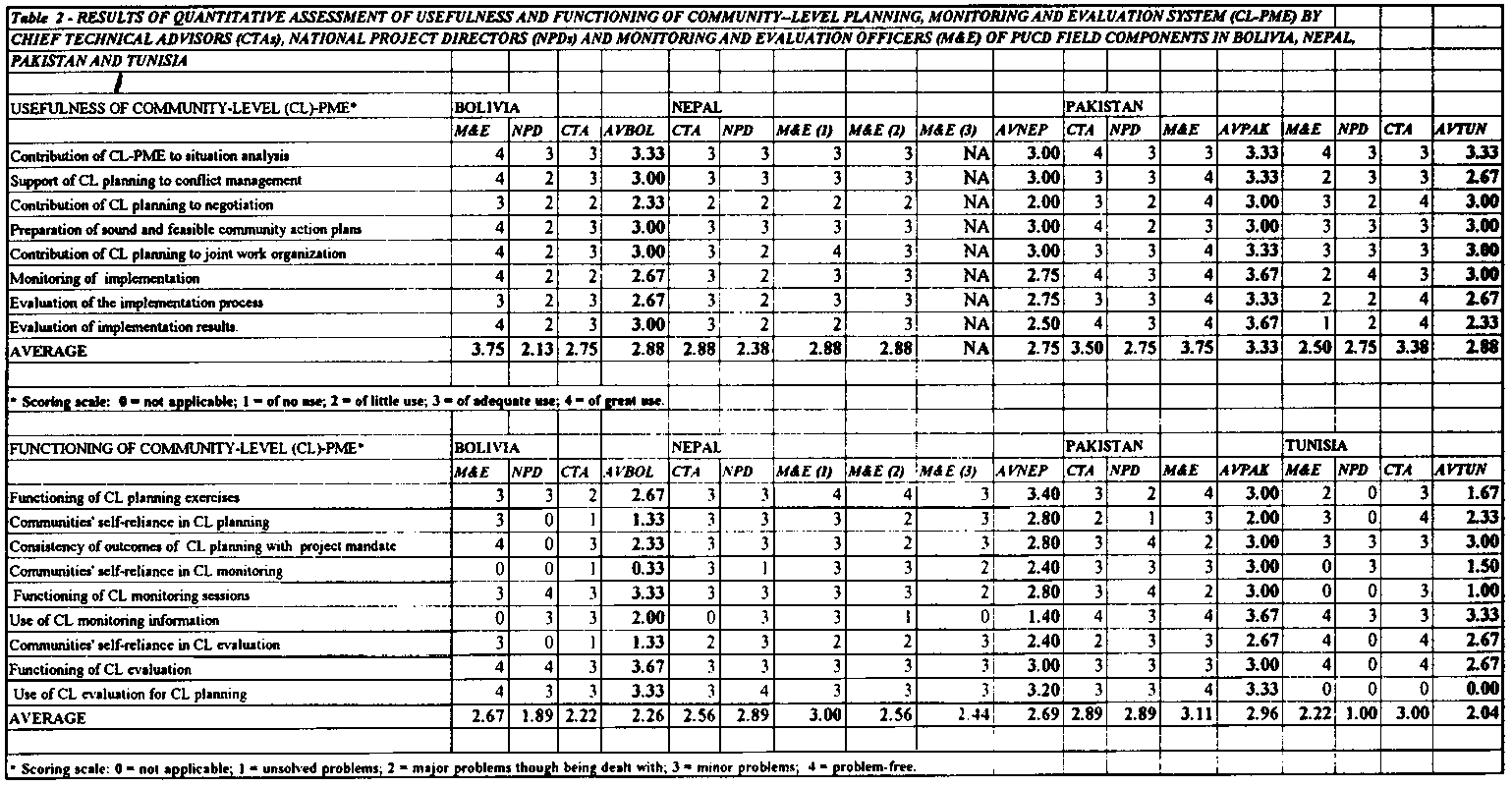 Table 2 - RESULTS OF QUANTITATIVE.ASSESSMENT OF USEFULNESS AND FUNCTIONING OF COMMUNITY-LEVEL PLANNING, MONITORING AND EVALUATION SYSTEM (CL-PME) BY CHIEF TECHNICAL ADVISORS (CTAs), NATIONAL PROJECT DIRECTORS (NPDs) AND MONITORING AND EVALUATION OFFICERS (M&E) OF PUCD FIELD COMPONENTS IN BOLIVIA, NEPAL, PAKISTAN AND TUNISIA
