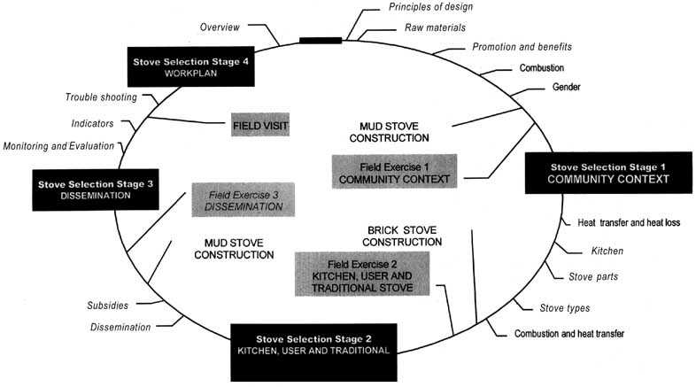 Essentially the model training course is designed to develop the trainees' understanding of the four stage stove selection process (see Figure 1). Practically, this is to be achieved by means of the trainees determining an improved cookstove design for a case study area, and then, during the final day of the training course, determining an improved cookstove design for the area in which they normally work. The training is highly participatory in nature.