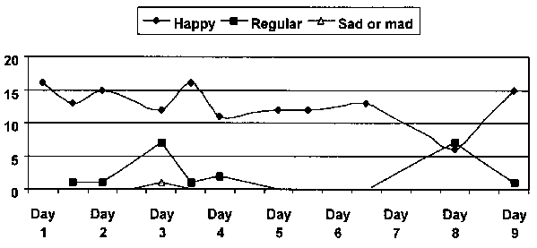 Before starting each day's activities, a mood meter was used to monitor the mood of the trainees. The idea was to alert the trainers to negative emotional states that might inhibit learning. If these were present the trainers would conduct an energising session before continuing with the training. The mood meter reading during the workshop is shown below.