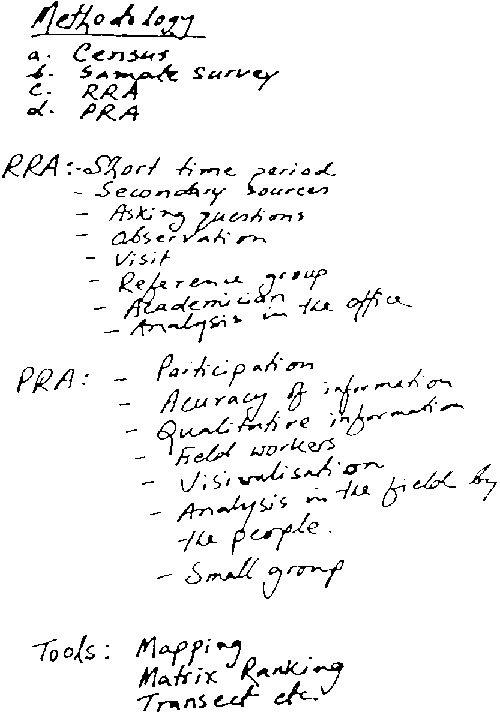 He then asked about the methodology of the community context field exercise. Participants suggested using observation or informal interview. Nazmul introduced the concept of rapid rural appraisal (RRA) and participatory rural appraisal (PRA), including the objectives of each and some examples of tools. At this point time was up.