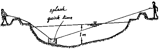 This is usually done on a clear day about 10 days before putting the baby fish in the pond. The shallow pond is disinfected splashing dissolved raw lime at a rate of 750 to 1025 kg/ha of pond area. Also, if preferred, the dissolved raw lime can be loaded on to a square-bottomed bamboo basket and pulled by rope from one bank to another so that the lime is evenly distributed in the pond as shown below.