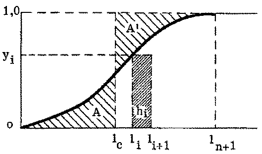 Dans la figure 7.1, la longueur moyenne de sélection lc est la longueur pour laquelle les deux surfaces hachurées A et A' sont égales. Si la courbe de sélectivité est symétrique ou presque, ce sera la longueur au point médian de la courbe, c'est-à-dire la longueur correspondant au pourcentage de captures de 50 pour cent, l'autre moitié des poissons entrés dans le filet s'échappant. Si elle n'est pas symétrique, lc peut être calculé en égalant les aires entre la courbe de sélectivité et l'axe des y et entre la ligne l = lc et l'axe des y. Supposons que l'on classe les longueurs et prenons la ième catégorie de taille hi, limitée par les longueurs li, et li +1: l'ordonnée correspondant à la ième catégorie est yi où i = 0, 1, 2,... n. Dans ce cas, l'aire à gauche de la courbe de sélectivité est égale à l'aire du rectangle de hauteur 1 et de base ln+1 moins l'aire située au-dessous de la courbe de sélectivité. La surface de celle-ci est approximativement égale à la somme des surfaces des rectangles pour chacune des catégories de longueur, soit S hi × y1. L'aire totale située à gauche de la courbe de sélectivité est donc ln+i - S hi,yi, qui, comme la hauteur totale de la courbe est 1, sera égal à lc. Si hi, est constant et égal à 1 cm, on aura: lc =ln+1 - S yi..