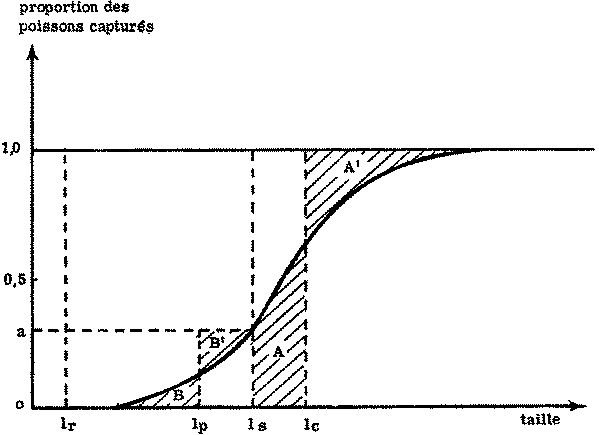 Ainsi, la courbe de sélectivité résultante, qui exprime l'entrée effective des poissons dans les captures, est le produit des courbes de recrutement et de sélectivité de l'engin, et à partir d'elle la longueur moyenne de sélection résultante peut être obtenue comme plus haut, en égalant les deux surfaces A et A'.