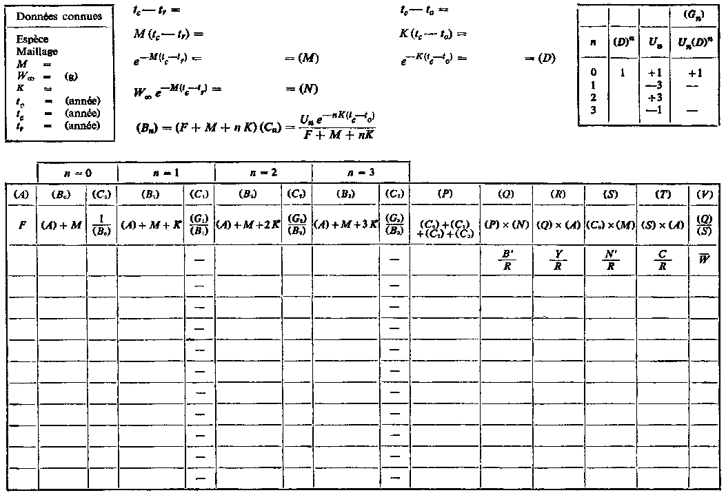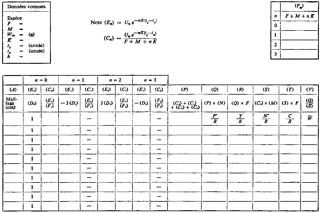 Les tables de travail qui figurent ci-après indiquent la marche à suivre pour calculer le rendement directement à partir de l'équation 9.5. La table A permet la recherche du rendement pour différentes valeurs de la mortalité par pêche F, la sélectivité tc étant constante. Nous porterons dans la case située en haut et à gauche les valeurs des divers paramètres du stock, en utilisant, soit les meilleures estimations disponibles, soit, si les connaissances ne sont pas suffisamment précises, une gamme de valeurs de la mortalité naturelle, etc. On emploiera un feuillet séparé pour chaque série de valeurs possibles. Au milieu, en haut, sont indiquées diverses opérations, les mêmes pour toutes les valeurs de F. Au-dessous, les quatre paires de colonnes (B) et (C) correspondent aux quatre termes de la sommation de l'équation 9.5. (Pour plus de facilité, la plupart des rubriques, colonnes, etc., sont désignées par des lettres, qui sont mises entre parenthèses lorsqu'elles sont reprises dans les entêtes suivants, pour éviter une confusion avec les termes des équations. A la seconde ligne pleine de l'en-tête figure, pour chaque colonne, la formule qui sera normalement utilisée pour calculer l'indication à y porter. A la troisième ligne est indiquée la signification de cette indication en fonction des divers paramètres.)