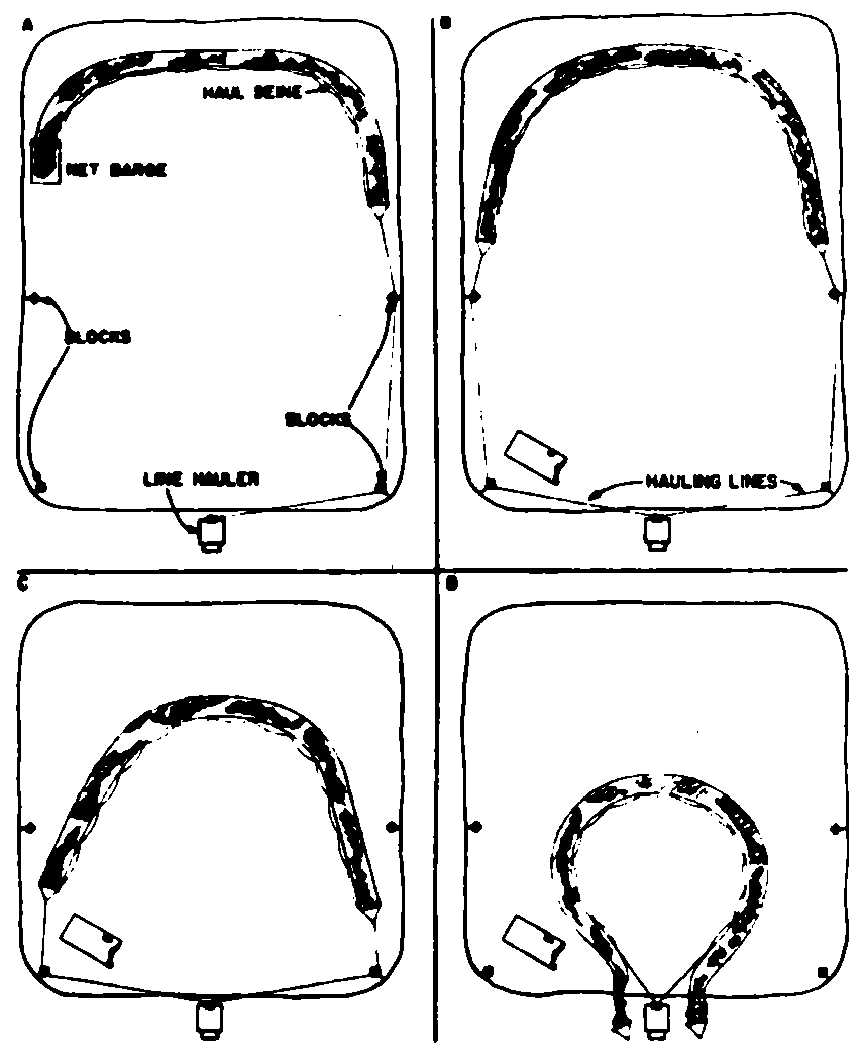 Figure 1 Seine pulling devices b) Schematic of haul seining procedure by winch with two drums (USA)