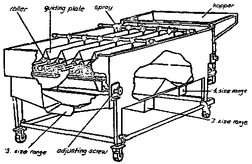The fish can be sorted into size by different screens. The screen can have several pairs of ribs with an increasing distance from top to bottom (Figure 13). The distance between two ribs is adjustable according to the grading requirement. There are graders where, instead of having fixed ribs, revolving rollers are used, as shown in Figure 14.