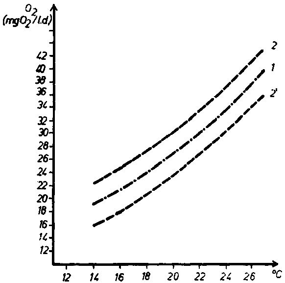Table 1 shows values of oxygen saturation of water as a function of water temperature. In pond fish farming the dissolved oxygen content of the water can be expressed as the absolute quantity of oxygen in one unit of water (mg/l; ppm) or as relative oxygen saturation (%).