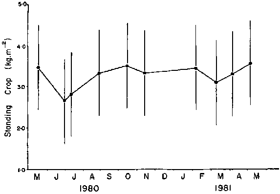 Table 1. Standing crop and production (kg dry wt m-2 at sites of different exposures to wave action. Sites 1-6 Polly Cove, Site 7 Dover Soi. P/B was calculated from the Modified Baardseth production estimates. (Cousens 1981b).