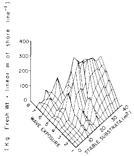 If survivorship of each shoot type is examined separately patterns related to environmental gradients are apparent. Survivorship of primary shoots to when an additional vesicle was present increased with increasing wave shelter (Cousens, 1981a). At exposed sites maximum survival was 5 years beyond the first vesicle for primary shoots; in wave sheltered areas the maximum survival was 11 years (opp. cit.). The position of the lateral shoot on a primary relative to the holdfast affects survivorship. Independent of age class laterals in the 0-30 cm (basal) portion of a shoot, had a survivorship of 90% after one year. Mortality of laterals decreased with distance from the holdfast/although mortality increased with age of lateral. The loss of laterals was primarily due to loss of the primary shoot rather than individual lateral shoot loss (opp. cit).
