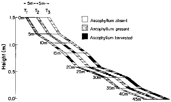 The upper limits of Ascophyllum nodosum distribution are controlled by its ability to resist desiccation and high temperatures (Schonbeck and Norton 1978). Ascophyllum nodosum dominates the mid intertidal on shores where it is present. Removal of A. nodosum temporarily allows other fucoids to become established for one or two years. (Hawkins and Hartnoll, 1985: Keser et al, 1981). Ice scour in the St. Lawrence river estuary controls the mix or dominance of A. nodosum and Fucus vesiculosus (Archami-bault and Bourget 1983). In areas of frequent ice scour F. vesiculosus dominates and A. nodosum is dominant in areas without or infrequent ice scour. Juvenile Ascophyllum plants are able to persist under canopies in the field. Once established the shoots are long lived, 5-15 years exceeding the life span of competitive fucoids. Ascophyllum is less susceptible to grazing than are other macrophytes. This is due to the low level of preference of Littorinids for Ascophyllum relative to other fucoids (Menge, 1975).