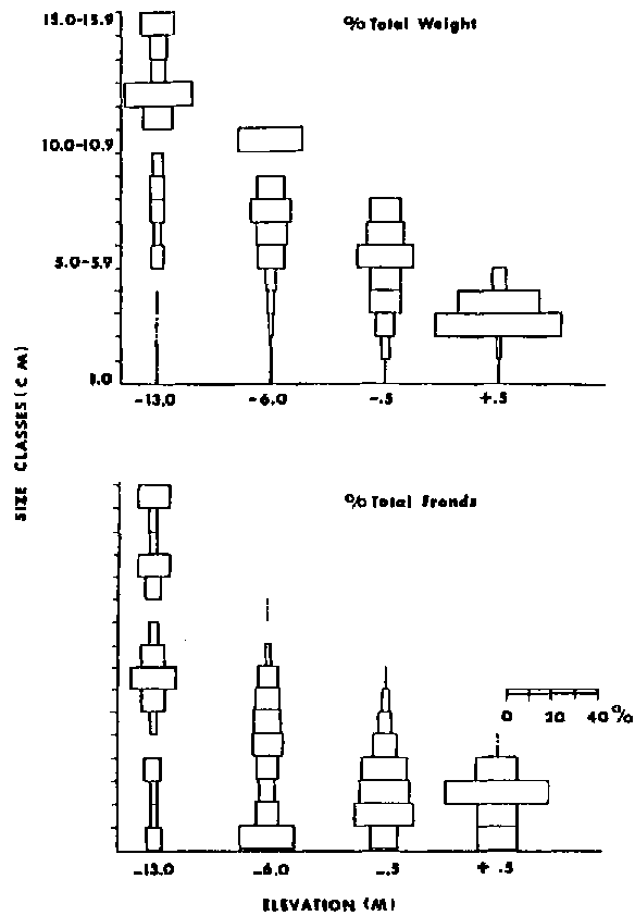 Figure 2. Size and weight distributions of Chondrus crispus fronds in the intertidal and subtidal zones at Jaffrey Point, Newcastle, New Hampshire, U.S.A. (from Mathieson and Burns, 1975).