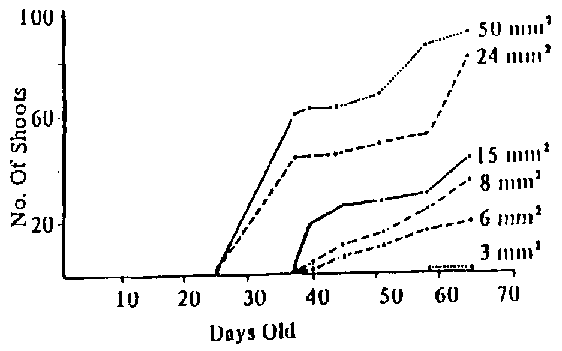 Figure 6. The relationship between sporeling area and number of upright fronds with Chondrus crispus; the plants were collected from the upper subtidal zone at Jaffrey Point, New Hampshire, U.S.A. (from Tveter and Mathieson, 1976 and Mathieson, 1982).