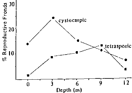 Irish moss extends from the littoral fringe (sensu Lewis, 1964) to -20m below mean low water, depending upon wave action, transparency and other local topographic conditions (cf. Bird et al., 1983; Femino and Mathieson, 1980; Mathieson and Prince, 1973; Prince and Kingsbury, 1973b). Even so, it is usually most abundant near M.L.W. to the mid subtidal zone (Mathieson and Prince, loc. cit.), with varying densities and morphologies occurring throughout this gradient (Fig. 2-4).