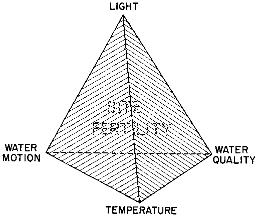 Temperature and light are felt to be relatively independent of water motion and its quality. It is not economic for farmers to provide control of these factors directly, so in selecting sites it is essential all be within tolerable limits. Water motion especially is a factor that must be taken into account in selecting sites. It often affects sediment in the water, which, in turn, affects light.