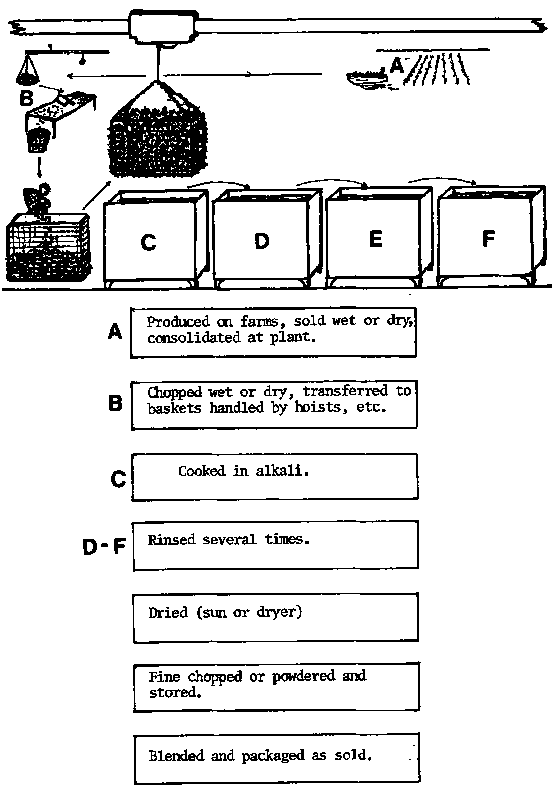 Figure 9. The alkali-treatment process for cottonii. Depending upon end product specifications, live or dried cottonii with or without preliminary treatment is often treated first in a hot alkali solution containing about 8.5 percent potassium hydroxide and then rinsed in successive tanks of water. The seaweed may be handled in baskets by an overhead traveling crane. Following a final draining, the treated material may be dried whole, or chopped and dried. The lower part of the figure shows a succession of processing steps that may follow depending on control laboratory analysis and desired nature of the final product